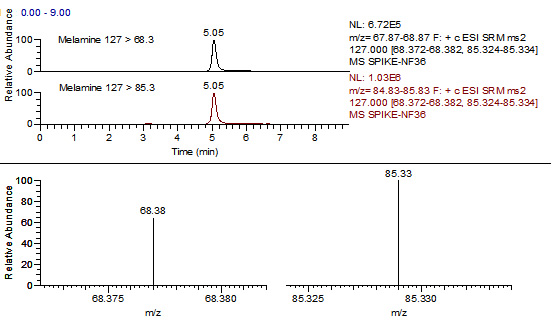 图1 奶粉中添加三聚氰胺(0.1 mg/kg)色谱图和质谱图